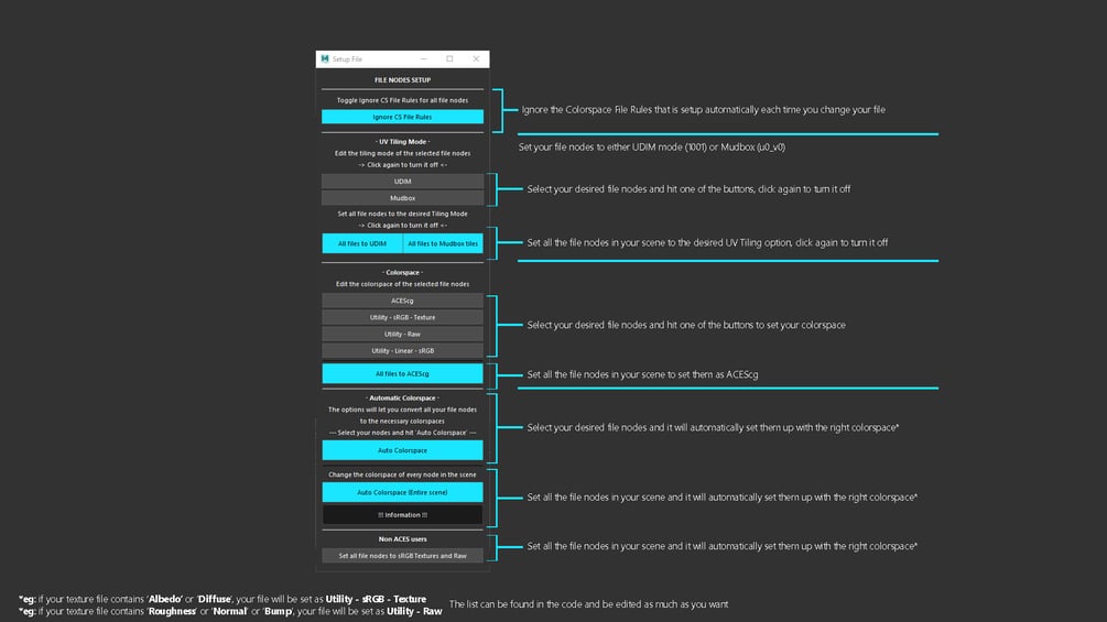 I built this in order to be faster in terms of Lookdev in Maya, as the Hypershade can sometimes be super slow when dealing with File Nodes, this tool can help you save a few clips but clicking on those options such as the Colorspace or the File Rules. Pretty simple but efficient but you have a scene with a lot of assets and textures.